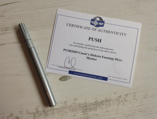 Cassie (Dakota Fanning) Hero Silver Marker This hero silver marker pen was used on screen by Dakota Fanning as the character Cassie in the movie Push. Cassie can be seen using this particular pen throughout the film with her note-pad where she draws her visions of the future. Share this: Click to share on X (Opens in new window) X Click to share on Facebook (Opens in new window) Facebook Like Loading...