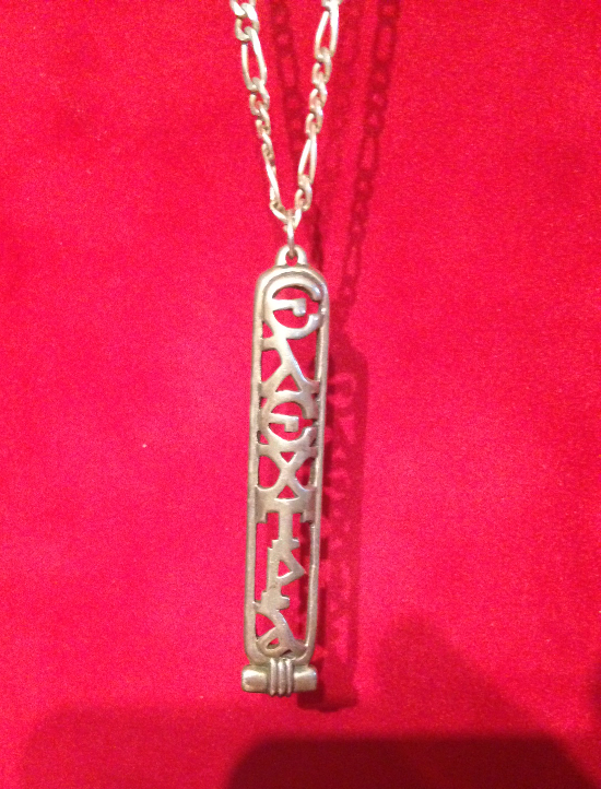 The necklace consists of a silver chain with a silver Egyptian cartouche featuring letters making up Elektra’s name and features very prominently on her costume.
