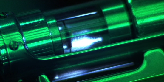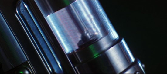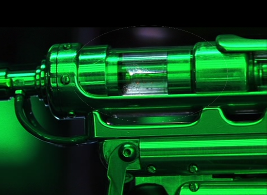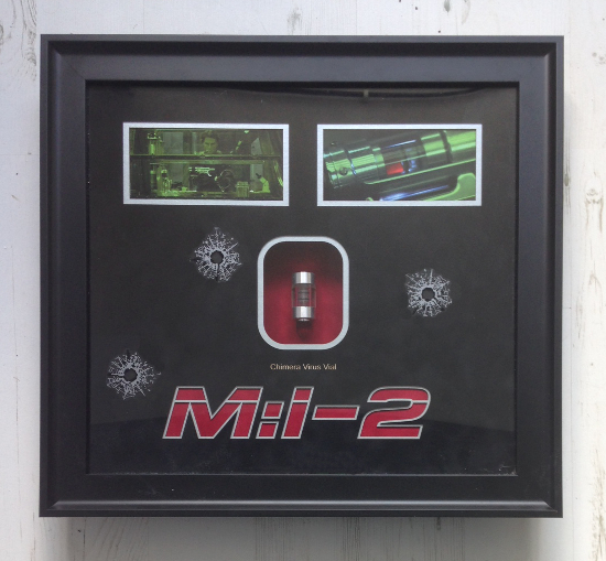 This is one of the hero ‘Chimera’ virus vials used by Tom Cruise as Ethan Hunt in Mission Impossible 2. This style can be seen used with the injector gun for administering the virus/anti-virus – contsructed of metal and glass with detailed internals that move when pushed by the spring-loaded part of the gun.