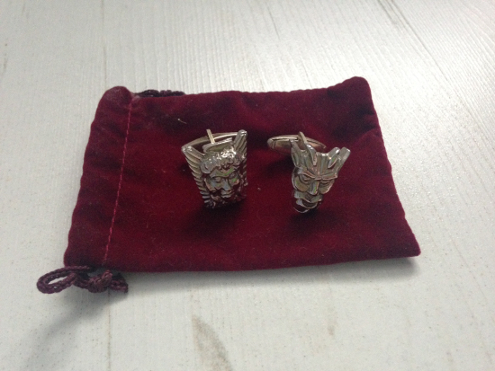 Original Devil & Angel Cane Detail Cufflinks This pair of original production used metal Angel & Devil head cane details came from the 2003 movie Daredevil. They have been converted in to cuff-links by a professional jeweler. Share this: Click to share on X (Opens in new window) X Click to share on Facebook (Opens in new window) Facebook Like Loading...